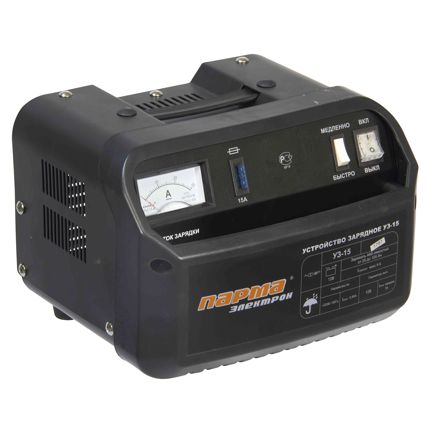 Устройство зарядное ПАРМА-Электрон УЗ-15 предназначено для бытового применения по обслуживанию аккумуляторных батарей автомобилей, тракторов, моторных лодок напряжением 12 Вольт. Способно заряжать батареи емкостью 25-105 Ач.