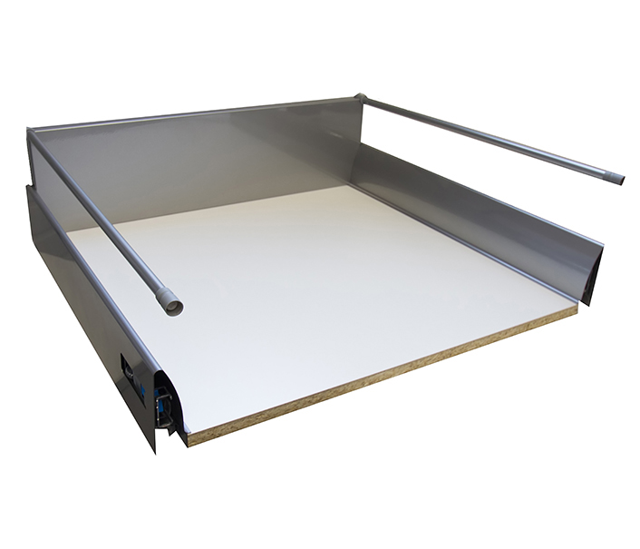 Металлический ящик с двойными стенками на направляющих полного выдвижения с системой плавного закрывания. Рассчитан на нагрузку 50 кг. Снабжён системой плавного и бесшумного закрывания. Может быть использован без фасада в конструкции, предполагающей внутренние ящики. В этом случае фасад заменяется фронтальной панелью как цвета серый металлик, так и любой другой. Дно ящика выполнено ид ЛДСП.
