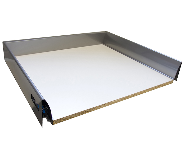 Металлический ящик с двойными стенками на направляющих полного выдвижения с системой плавного закрывания. Рассчитан на нагрузку 50 кг. Снабжён системой плавного и бесшумного закрывания. Может быть использован без фасада в конструкции, предполагающей внутренние ящики. В этом случае фасад заменяется фронтальной панелью как цвета серый металлик, так и любой другой. Дно ящика выполнено ид ЛДСП.