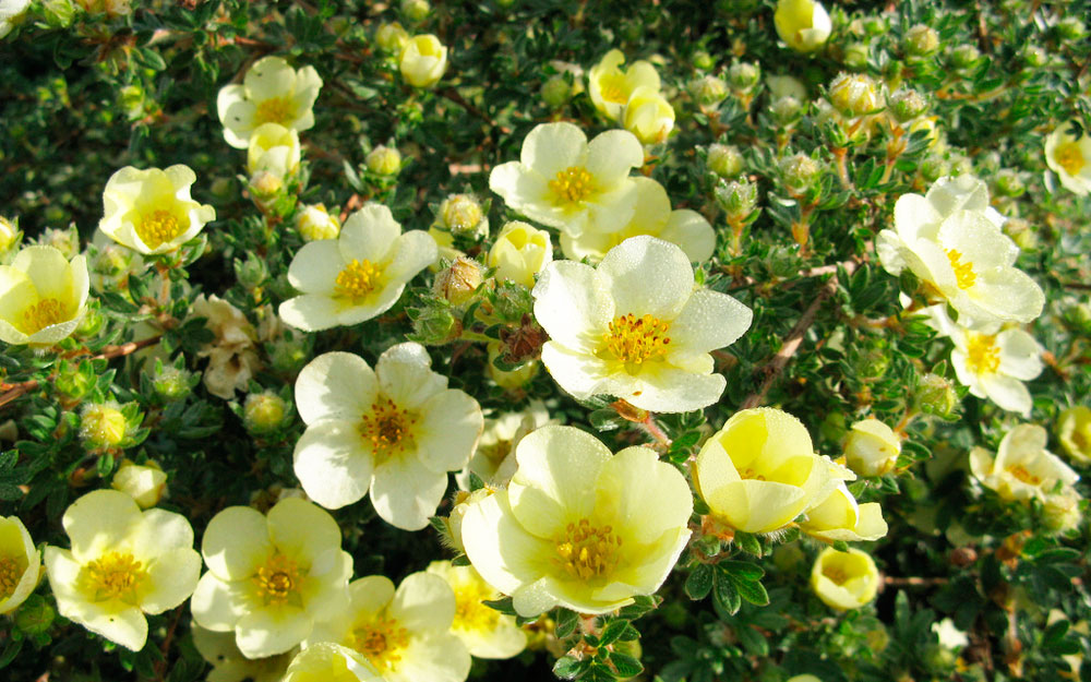 Лапчатка кустарниковая - цветущий, густой, неприхотливый кустарник. Цветет обильно, цветки разнообразной окраски: белые, желтые, розовые, малиновые. Листья светло-зеленые. Морозостойка.