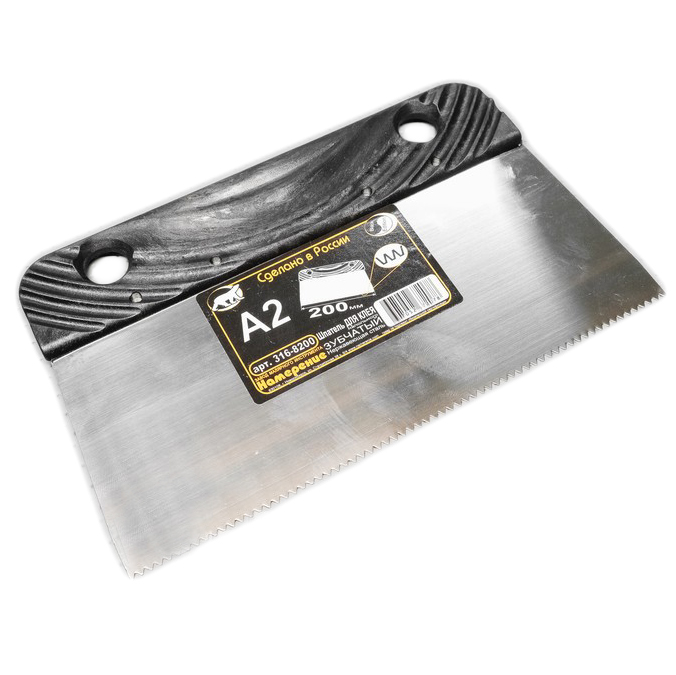 Используется для нанесения всех видов клея под ПВХ покрытия, а также другие покрытия, требующие равномерного нанесения тонкого слоя клея на поверхность. Использование зубчатого шпателя имеет ряд преимуществ: уменьшение расхода клея, получение нужной гребенки, в результате чего клей не вылазит через стыки, уменьшение время открытой выдержки клея. Допускается многократное использование с контактными водно-дисперсионными клеями.