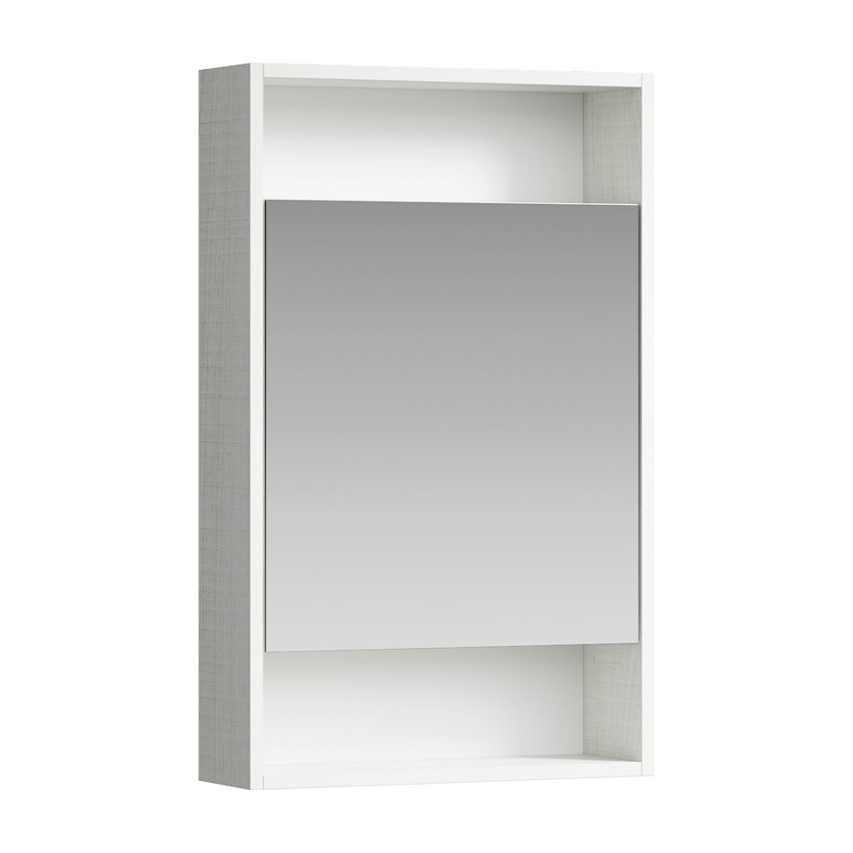 Универсальный левый/правый зеркальный шкаф имеет две открытые полочки.