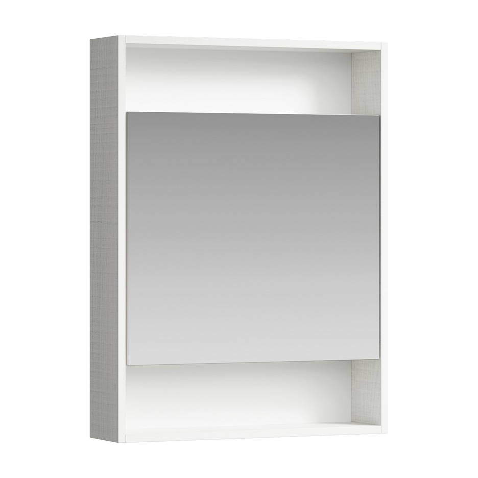 Универсальный левый/правый зеркальный шкаф имеет две открытые полочки.