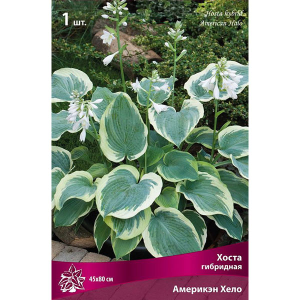 Америкэн Хело: листья крупные, слегка гофрированные, сине-зеленые с контрастной широкой кремово-белой каймой. Белые цветки появляются в начале лета. Высота растения больше 70 см.