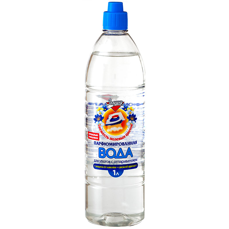Парфюмированная вода для утюгов Золушка облегчает глажение и придает белью нежный свежий аромат, предохраняет внутренние детали утюга от образования известкового налета и накипи. Вода избавляет белье от появления пятен при отпаривании.