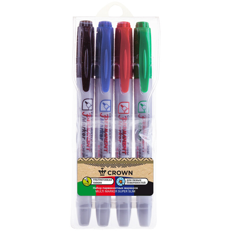 Набор CROWN Multi Marker – перманентные (постоянные) маркеры на спиртовой основе. Цвета - красный, синий, черный, зеленый, диаметр пишущего узла - 1 мм, тип пишущего узла – пулевидный. Страна производства - Южная Корея.