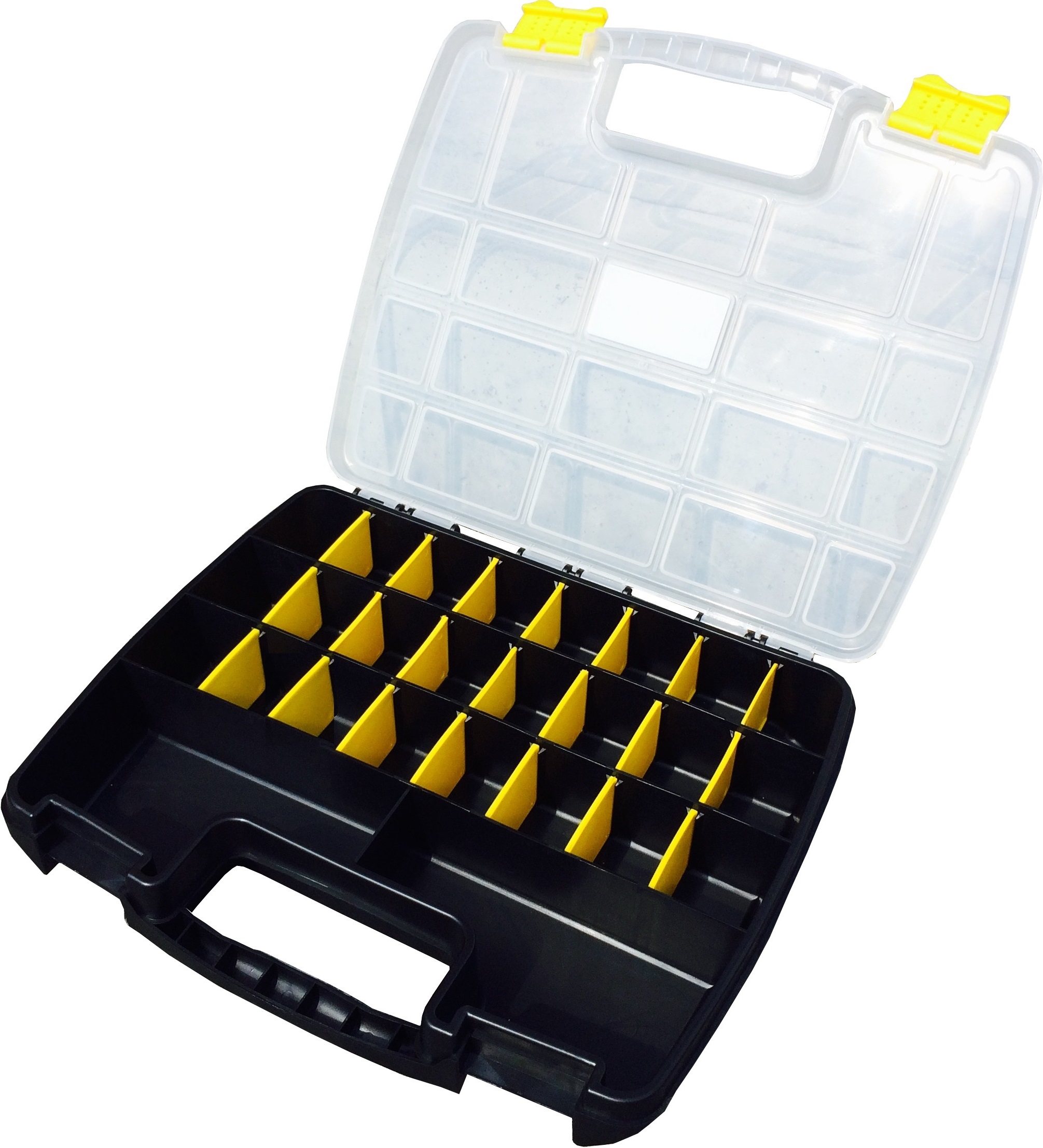 Органайзер для инструментов — разновидность системы хранения. С его помощью можно удобно разложить ручной инструмент, крепеж, детали и разные строительные мелочи. Как правило, такой органайзер выполнен в виде прочного контейнера с отсеками. Материал — пластик. Особенности подобного хранения: большое количество секций позволяет рассортировать метизы по размеру и типу. Крышка закрывается на защелки. У объемных ящиков предусмотрена ручка для переноски.