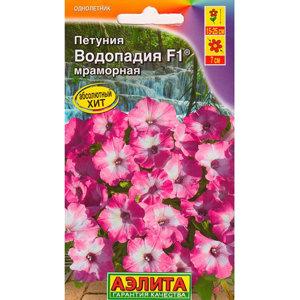 Абсолютный хит! Серия многоцветковых петуний каскадного типа, которая отличается совершенно новой полуампельной формой. Уникальность этих гибридов в том, что новые цветоносные побеги образуются без прищипки в пазухах листьев в середине куста, не оставляя пустот. Растения формируют пышные кустики, высотой 15-25 см. Поникающие побеги длиной до 70 см полностью усыпаны яркими насыщенными цветками 7 см и спускаются восхитительным водопадом. Гибриды устойчивы к повышенным температурам и неблагоприятным погодным условиям. Однако мраморная расцветка при недостаточном освещении может изменяться. Петунии Водопадия F1® наилучшим образом подходят для подвесных кашпо и корзин.
