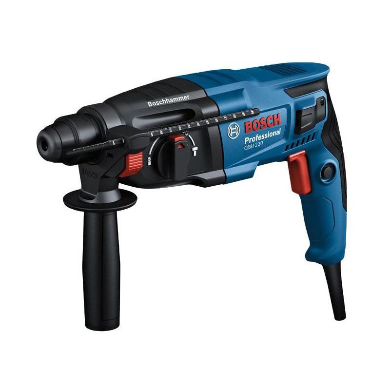 Высокой мощностью в 720 Вт отличается перфоратор BOSCH GBH 220 [06112a6020]. Благодаря небольшому весу, эргономичной конструкции и двум прорезиненным рукояткам обеспечивается максимум комфорта при эксплуатации. Инструмент обладает силой 2 Дж и частотой удара до 4800 в минуту, что позволяет бурить отверстия не только в бетоне, а также кирпиче, металле и пластмассе. В комплектацию входит патрон SDS-plus. Наличие ограничителя глубины значительно упрощает работу с инструментом.