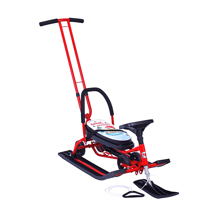 Игрушка спортивная транспортная из металла «SNOWKAT» с Т-образной съемной ручкой толкателем и колесной базой. Выдвижная колесная база. Колеса – литая резина. Усовершенствованная складная спинка с эргономичной конструкцией и боковой поддержкой. Ремешок для безопасного катания ребенка на снегокате. При необходимости ручку-толкатель можно легко снять, а снегокат тянуть за буксировочный тросик. Грузоподъемность при установленном толкателе – 30 кг, при снятом толкателе – 100 кг.