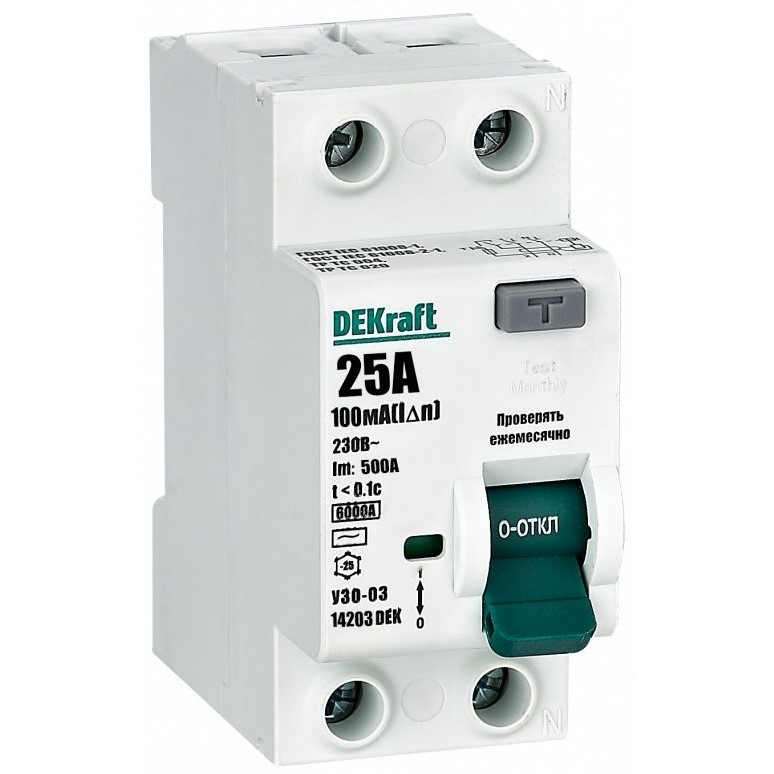 Выключатель дифференциального тока серии УЗО-03 DEKraft, 2P, номинальный ток 25А, номинальный дифференционный ток 30мА, электромеханический, тип дифференциального расцепителя - AC, на DIN-рейку. ВДТ устанавливаются в сетях напряжением до 400В переменного тока. ВДТ применяются для защиты электроустановок от риска возникновения пожаров вследствие утечек тока. Конструкция устройств позволяет эксплуатировать их даже при низкой температуре. При сборке выключатель дифференциального тока (ВДТ) и автоматический выключатель (для защиты ВДТ) устанавливаются последовательно, при этом номинальный ток аппарата должен быть на одну ступень выше — т. е. 20А при установке последовательно с автоматом на 16А, 32А при установке с автоматом на 25А.