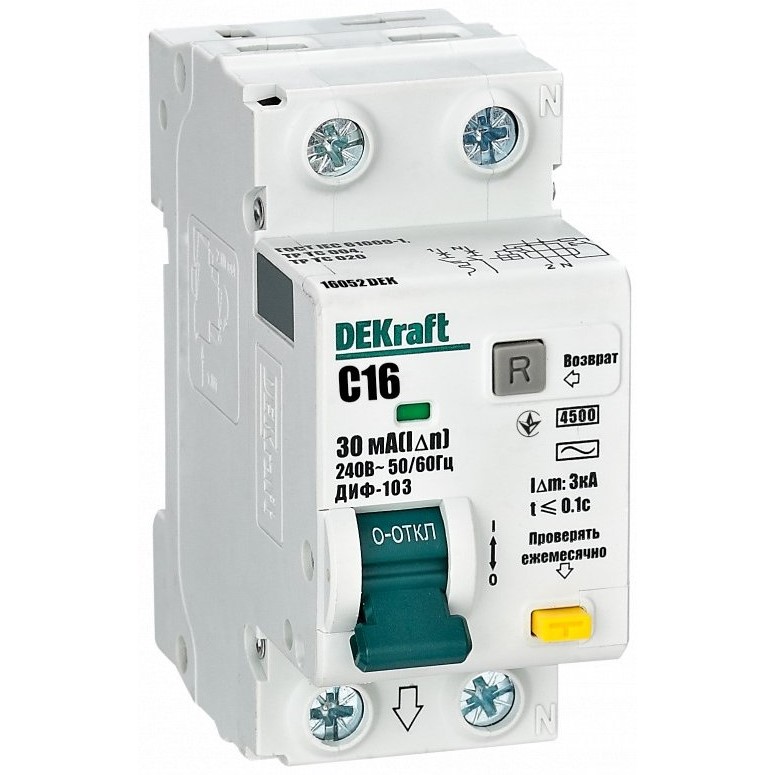 Автоматическими выключателями дифференциального тока серии ДИФ-103 DEKraft, 1N+P, номинальный ток 16А, номинальный дифференционный ток 30мА, тип дифференциального расцепителя - AC, кривая отключения - С, на DIN-рейку. АВДТ (автоматическими выключателями дифференциального тока) сочетают функции автоматического выключателя и УЗО (ВДТ), обеспечивают три вида защиты — от короткого замыкания, перегрузки и возникновения утечки тока (в частности, вследствие прикосновения человека к токоведущим частям). АВДТ с отключающей способностью 4,5кА применяются в распределительных, учётно-распределительных, телекоммуникационных щитах и др. в жилищном, гражданском строительстве, сельском хозяйстве, инфраструктуре объектов промышленности.