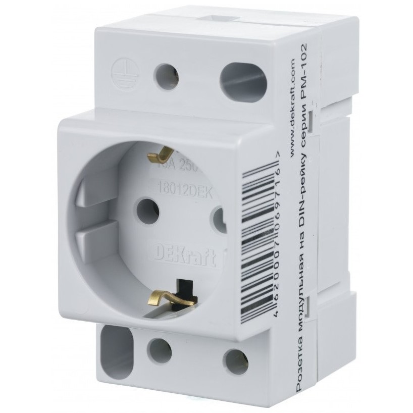 Розетка модульная серии РМ-102 DEKraft; номинальный ток – 16 А; с заземляющим контактом; ширина – 45 мм; установка – на DIN-рейку; установочное положение – любое; степень защиты – IP20. Розетки модульные предназначены для подключения переносных светильников или электрического инструмента малой мощности во время профилактических и ремонтных работ в электрической сборке по месту установки.