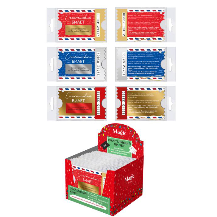 Новогоднее подвесное украшение Счастливый билет - оригинальный способ поздравления. Представляет из себя билет из плотного картона, с ярким красочным тиснением и набором цифр. Все цифры подобраны таким образом, что сумма пяти первых цифр равна сумме пяти последних, таким образом в руках у вас обязательно будет счастливый билет. Более того, на каждом билете есть пожелание, которое спрятано под скретч-слоем. Чтобы получатель узнал его, ему необходимо стереть скретч-слой любым предметом с острым краем. Оригинальный, необычный, с ноткой ностальгии о прекрасных прошедших временах молодости и юности, такой презент никого не оставит равнодушным.