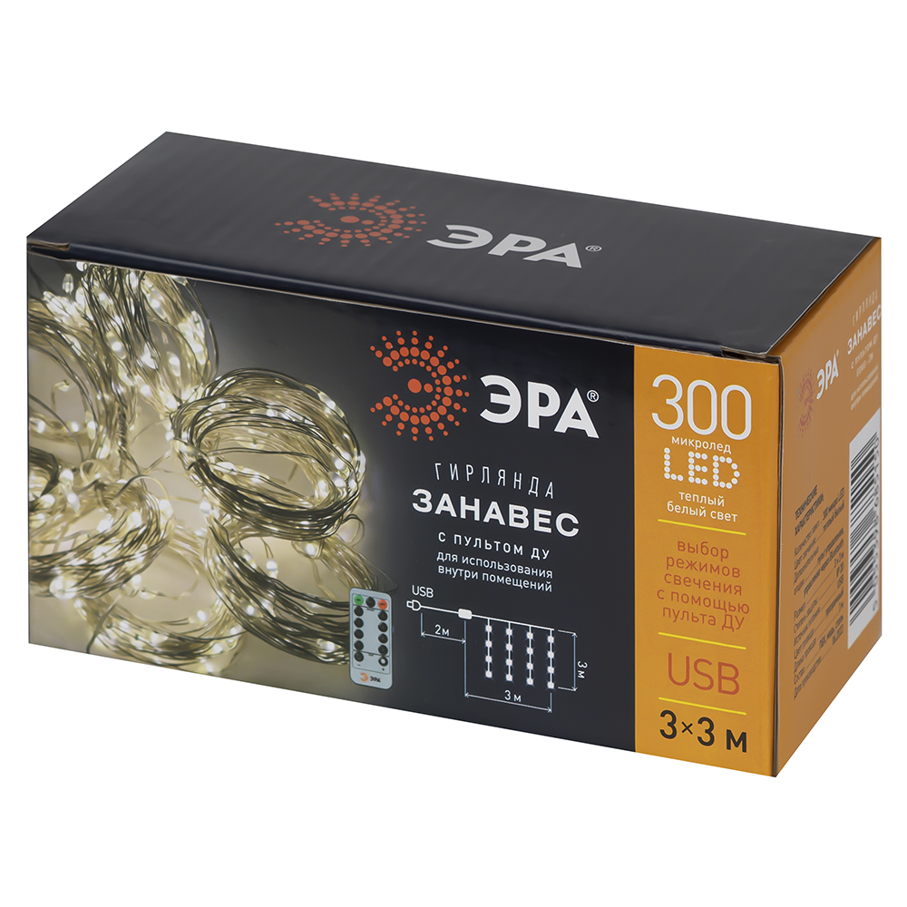 Гирлянда ЭРА Занавес с пультом, теплый белый, 300 LED, 3x3 м, с пультом, USB, 220 В, IP20 предназначена для создания декоративной и праздничной иллюминации. Низкий расход электроэнергии. Использование светодиодов позволяет сократить расходы на электроэнергию до 80%. Длина гирлянды дает возможность создавать различные световые композиции