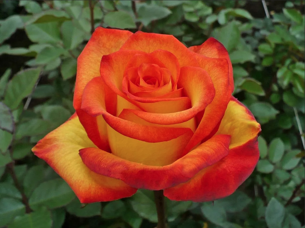 Обладательница невероятной двуцветной окраски. В бутоне переливаются от кончика лепестка до его основания красные и желтые оттенки, создавая эффект пляшущего огня. Плотные лепестки (40 штук в одном) с алыми, слегка отогнутыми краями аккуратно закручены в высокий бутон. Цветки розы никогда не теряют своей формы, плавно распускаясь, они украшают клумбу, сменяя друг друга в течение всего сезона. Зацветает рано. Цветок не повреждается ни солнцем, ни дождем, сохраняя насыщенный цвет и чистоту лепестков. Аромат у цветка слабый, едва уловимый.