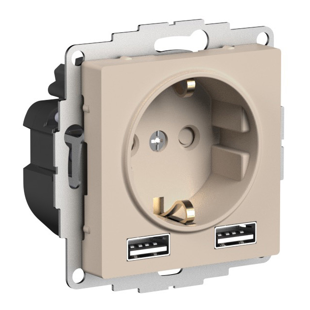 Розетка силовая Systeme Electric (ранее Schneider Electric) серии AtlasDesign 16А с заземлением и шторками с розеткой USB, с двумя разъемами типа А. Заземляющий контакт обеспечивает дополнительную защиту от удара электрическим током. Шторки обеспечивают дополнительную безопасность в доме, где находятся дети. Одно устройство позволяет как подключить бытовые приборы, так и зарядить мобильные устройства.