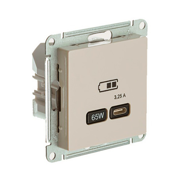 Розетка Systeme Electric (ранее Schneider Electric) серии AtlasDesign USB с разъемом типа C высокоскоростная. Самая современная USB-зарядка позволяет заряжать ноутбук, а также смартфоны последнего поколения, которые поддерживают функцию быстрой зарядки.