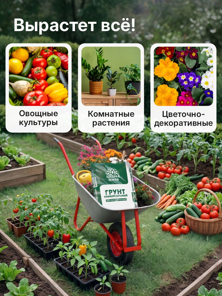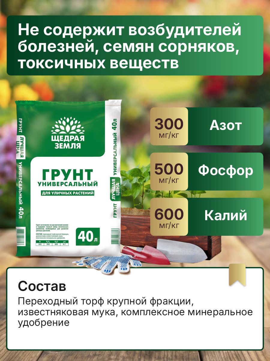 Готовый к применению универсальный питательный грунт с минеральными удобрениями. Применяется для посадки и пересадки всех садовых растений. Не содержит возбудителей болезней, семян сорняков, токсичных веществ. Полностью готовый к применению.