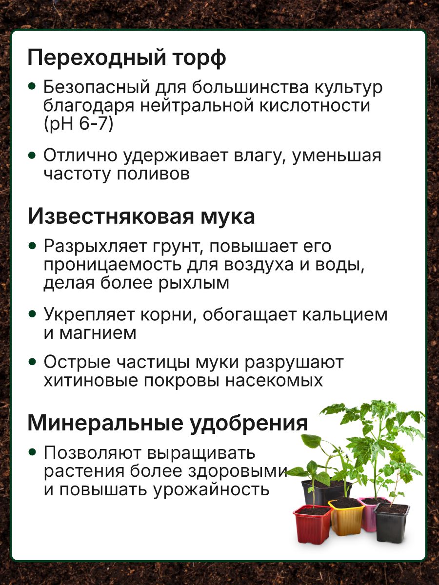 Состав: Переходный торф крупной фракции, известняковая мука, комплексное минеральное удобрение.