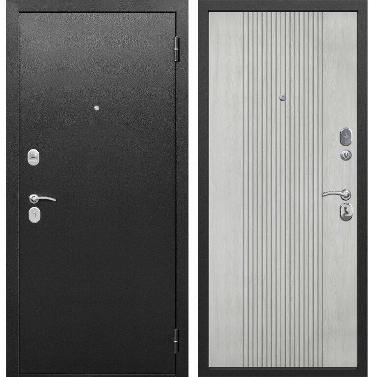 Внешнее покрытие: порошково - полимерное антик серебро. Толщина полотна 60 мм. Внутреннее покрытие: МДФ - панель 6 мм белый ясень. Наполнение: Пенополистирол. Уплотнитель: 2 контура уплотнения из пористой резины. Петли: 2 шт. наружные, открывание 180°. Ручка: раздельная. Броненакладка: декоративные на оба замка.