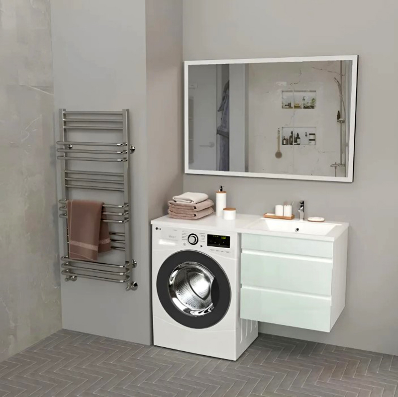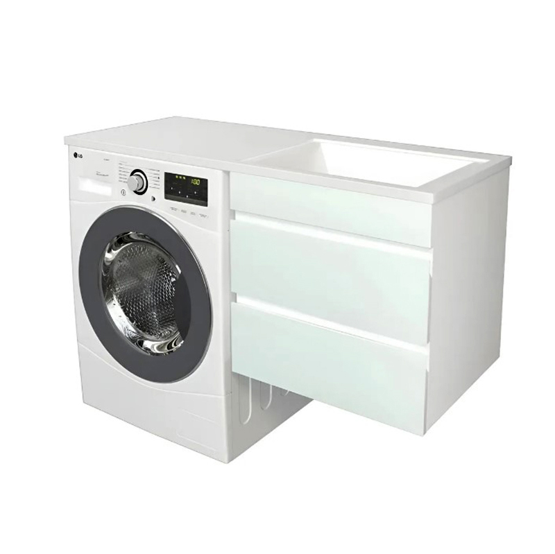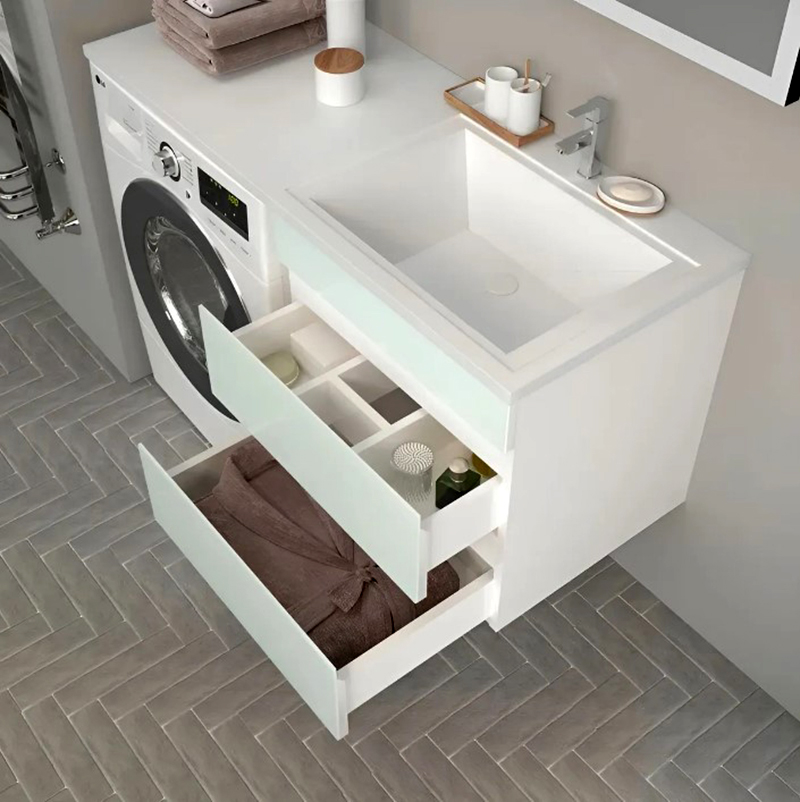 Серия мебели ALTO — готовое решение для ванной комнаты со стиральной машиной под единым умывальником-столешницей. Ящики тумбы оснащены скрытыми направляющими полного выдвижения, с функцией плавного закрывания. Корпус выполнен из ЛДСП, фасад — МДФ в пленке с закаленным стеклом Lacobel. Умывальник из литьевого мрамора российского производства, доступен с левым или правым расположением чаши. Ширина умывальника 1200 мм. В комплект с тумбой входит сифон, с возможностью подключения стиральной машины и кронштейн для крепления крыла умывальника. Предусмотрена возможность отвода воды в пол.