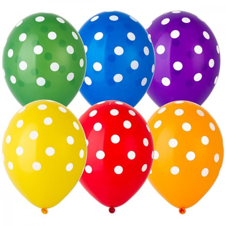 Высококачественный шар из натурального латекса. Ассорти из 6 цветов шаров ярких оттенков. Пастель - матовый оттенок цвета. Шары с пятисторонним - круговая печать, крупным шелкографическим рисунком Горошек.
