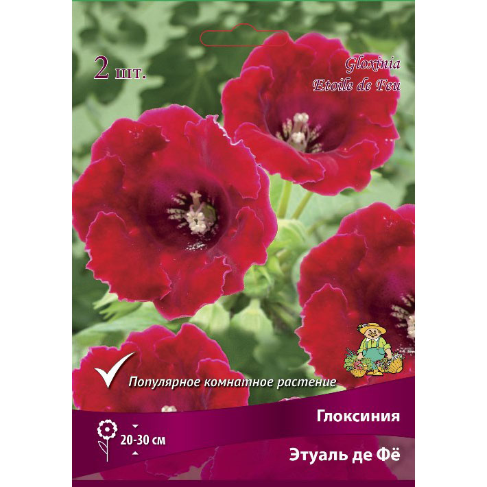 Глоксиния - многолетнее травянистое бесстебельное растение с клубневидным корневищем и супротивно расположенными бархатистыми листьями. Самый эффектный представитель в своем семействе. На одном взрослом растении может быть до 50-100 крупных роскошных цветков-граммофонов. Окраска различная: белая, красная, синяя, с крапом и без, фиолетовая, малиновая. Этуаль де Фё - высота растения 20-30 см, цвет насыщенно-красный.