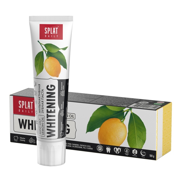 Натуральные эфирные масла лимона и мяты перечной мультиактивной зубной пасты Splat Daily Whitening обеспечивают свежесть дыхания. Эфирное масло мяты перечной проявляет антибактериальное действие, способствует снижению кровоточивости дёсен, освежает полость рта, обладает антисептическим действием. Папаин и пирофосфаты способствуют уменьшению зубного налёта.