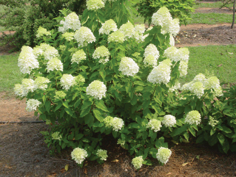 Цветки интересной окраски, в начале цветения зеленоватые, затем светлеют до белых с лёгким лимонным оттенком. Куст густой, высотой 180-240 см и шириной 180 см, соцветия крупные, плотные, изящные, хороши для сухих букетов и для срезки, цветёт обильно на побегах текущего года, место полутенистое или солнечное, требует плодородной и влажной почвы. Соцветия крупные, 30-35 см в длину.