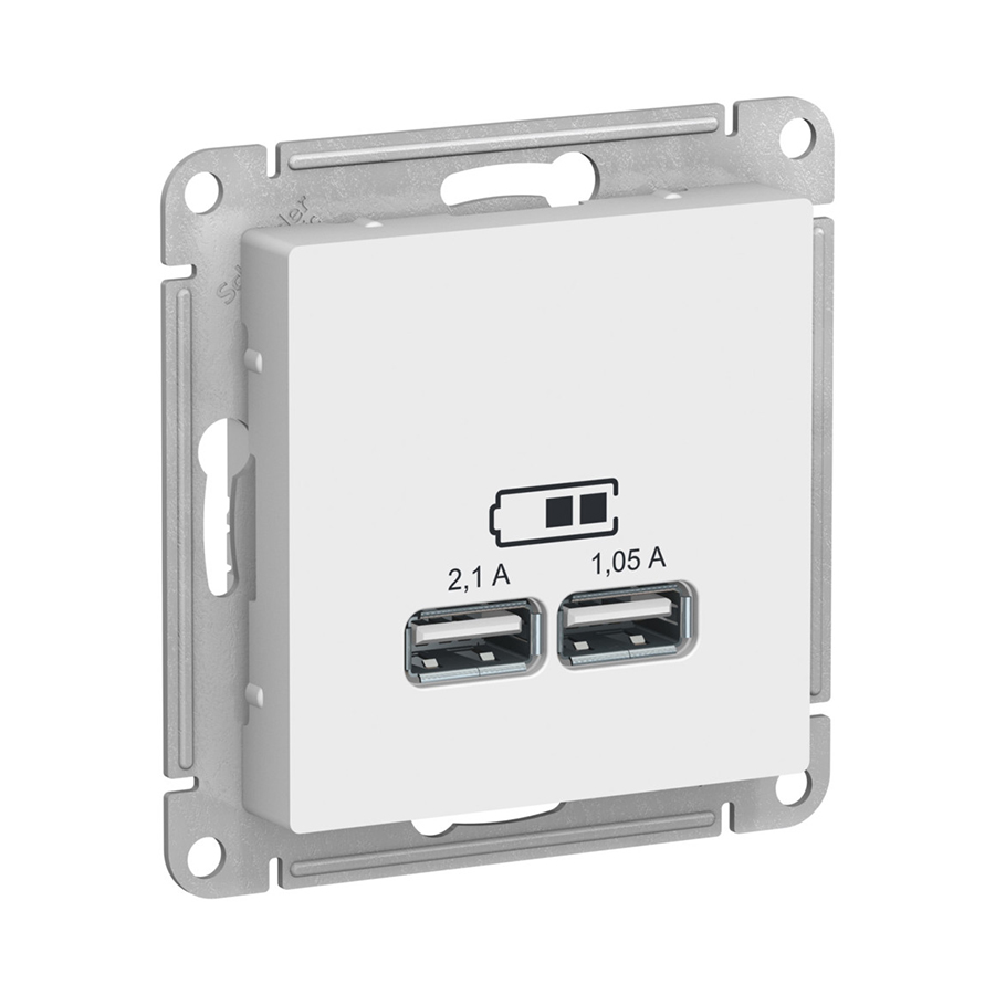 Механизм Systeme Electric серии AtlasDesign в цвете ЛОТОС розетки для зарядки с двумя разъёмами USB с выходными напряжением 5 В постоянного тока и выходами с номинальным током по 2,1 А. USB розетка позволяет напрямую заряжать одно или два мобильных устройства. Лицевые детали из качественного ABS-пластика, устойчивого к царапинам и УФ-излучению. Усиленные прямые монтажные лапки для лучшей фиксации механизма в монтажной коробке.