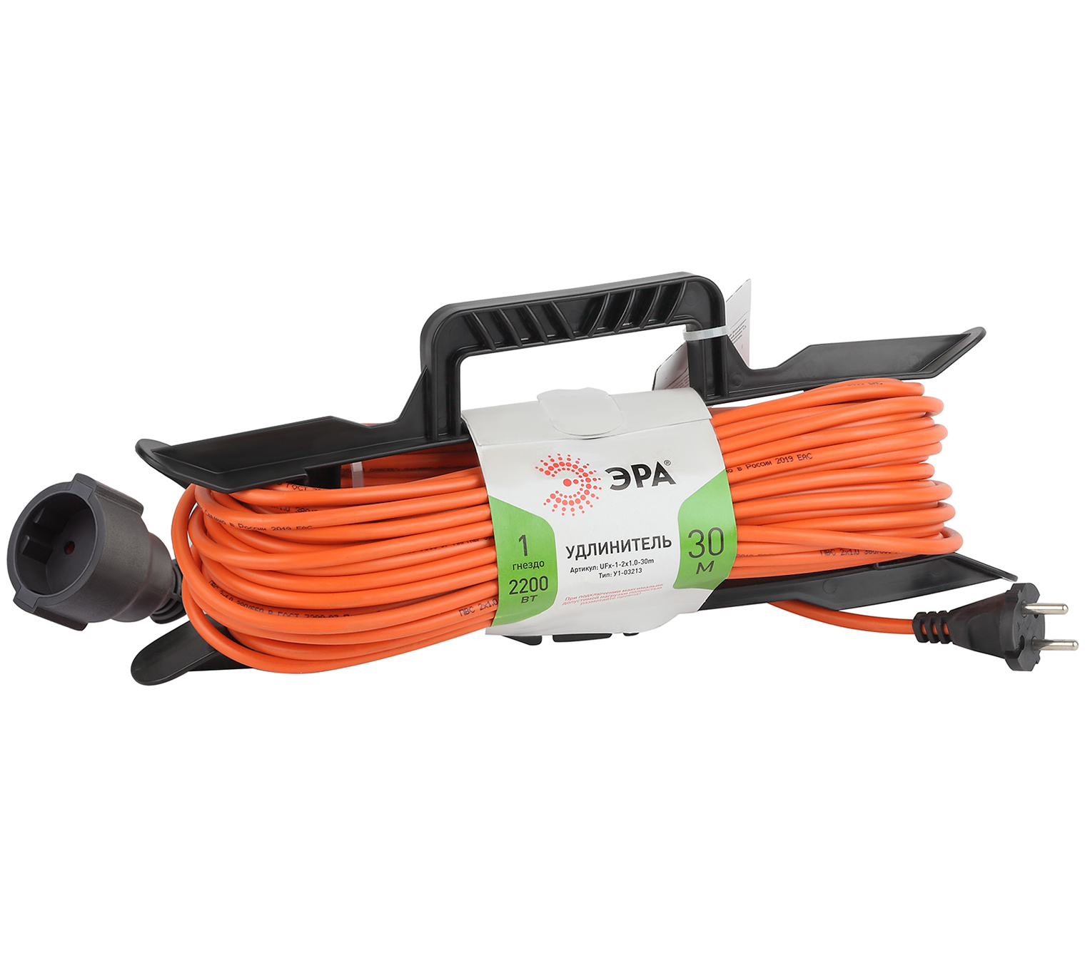 Удлинитель силовой на рамке UFx-1-2x1.0-30m без заземления, ПВС 2х1м2, 1 розетка, 30м, степень защиты IP20. Мощность 10А/2200Вт. Используется для работы на строительных площадках или дачных участках. Удобен при работе с приборами находящимися удаленно от стационарной розетки,. Например, газонокосилки, электрические, пилы, триммеры или электродрели. Провод в удлинителях Эра сделан из 100% меди, что делает его абсолютно пожаробезопасным. Рама-полипропилен.
