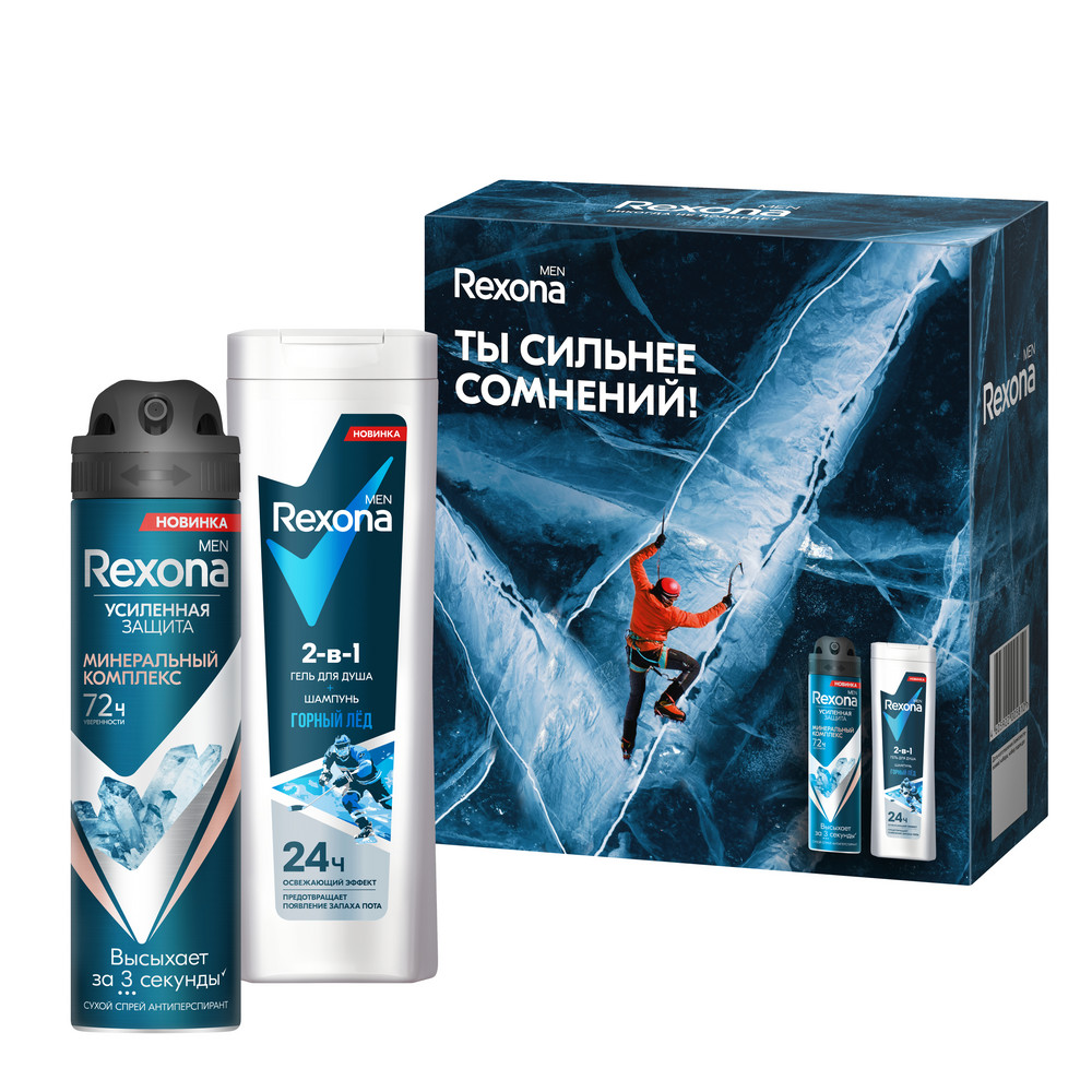 Если вы уверены в себе, то можете смело ответить на любой вызов. Откройте для себя мужской подарочный набор Rexona Men Сильнее сомнений. Начните утро с мужского геля для душа и шампуня 2 в 1 Горный лед с охлаждающим эффектом. Он бережно и эффективно очищает кожу, а также предотвращает появление запаха пота до 12 часов, обеспечивает свежесть, ощущение увлажнения и укрепление защитного барьера кожи благодаря специальной формуле с пребиотическим 3х комплексом, который содержит глицерин, инулин и молочную кислоту. Аромат геля раскрывается яркими цитрусовыми и акватическими нотками, переходящими в аккорды эвкалипта; кедр и мускус в базе придают аромату элегантность. Шлейф держится на коже до 24-х часов и дарит ощущение свежести и комфорта в течение всего дня.