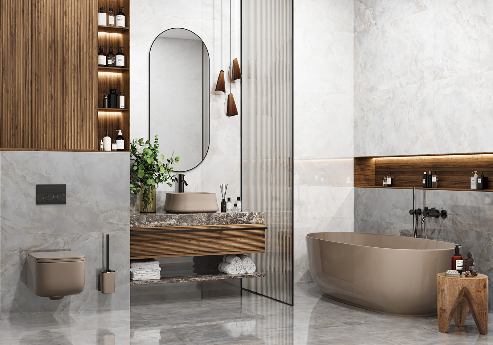 Для создания дизайна керамогранита Onice Vetro в формате 600х1200 мм дизайнеры бренда вдохновлялись полудрагоценным дымчатым ониксом, его многослойной глубокой текстурой, которая состоит из множества градиентов и полутонов. Полированная поверхность усиливает глубину и подчеркивает детали текстуры. Два цвета в составе коллекции позволяют создать индивидуальный дизайн, выделяя функциональные зоны акцентным цветом или использовать один цвет для всего пространства.
