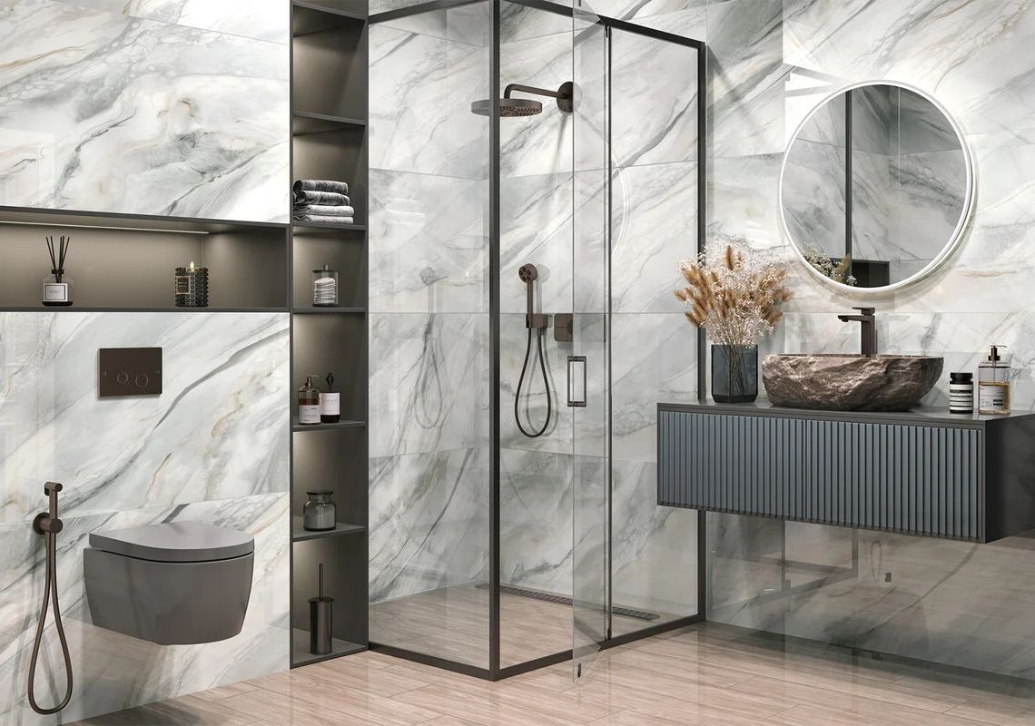 Само название «чернильный камень» говорит само за себя, ведь это симбиоз двух текстур: многоцветных красочных разводов и градиентной дымчато-серой текстуры мрамора. Такой дизайн украсит современное пространство, добавит динамики интерьеру, а в сочетании с бетоном поможет создать уникальный интерьер. Керамогранит представлен в формате 600х1200 мм, с полированной поверхностью и ректифицированными краями.
