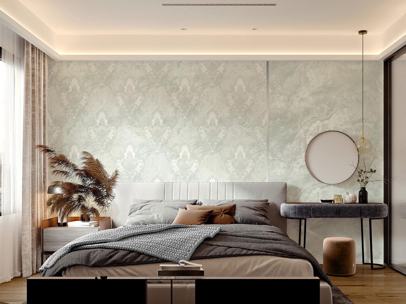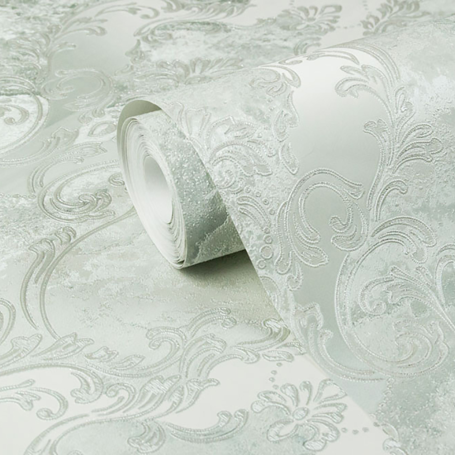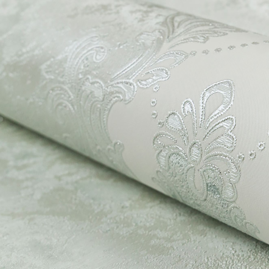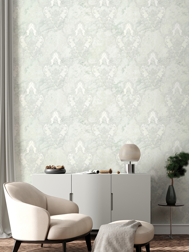 Основной рисунок коллекции «Бриджит» — тиснённый дамаск, нанесённый на фон с текстурой камня. Барочный орнамент обогащён декоративными эффектами: глиттером, перламутром и интерферентными переливами. Они добавляют поверхностям мягкое сияние и подчёркивают роскошный характер серии.