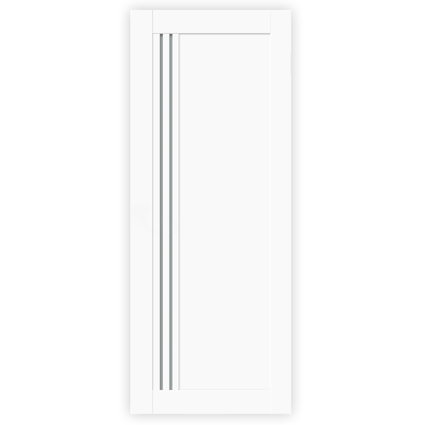 Межкомнатное царговое остекленное полотно. Универсальное. Покрытие матовое гладкое, выполнено экошпона (ПВХ). Обвязка полотна из царговых элементов. Внутренняя наборка представляет собой МДФ вставки + стекло мателюкс. Полотно поставляется без фурнитуры и врезки под нее. Используется бескромочная технология.