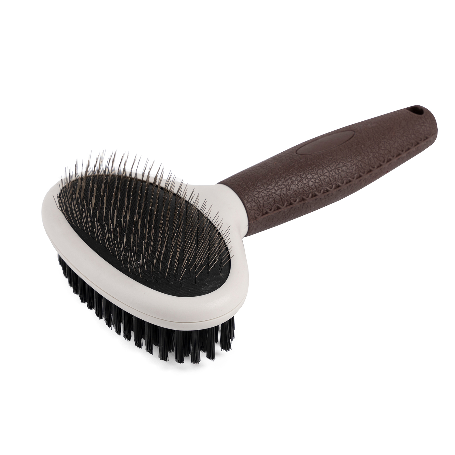 Двусторонняя щетка-пуходерка для животных имеет зубья из металла с одной стороны и мягкую щетину с другой. Мягкая сторона щетки придает гладкость, нежность и шелковистость шерсти, а также удаляет из нее мелкий мусор и грязь. Металлическая часть помогает убрать колтуны, загрязнения и мертвую шерсть и стимулировать рост новой, служит для разъединения всех шерстинок.