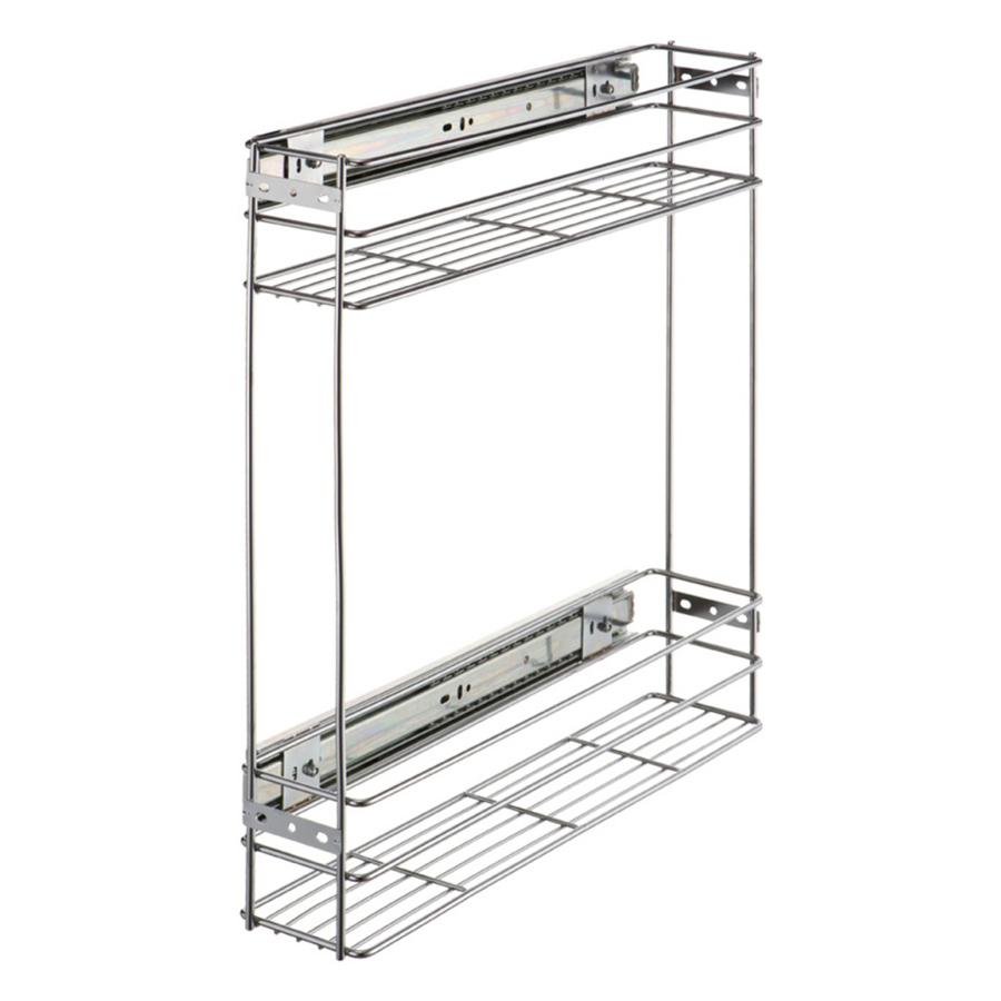 Корзина выдвижная 2-х ярусная с универсальным боковым креплением. Поставляется в комплекте с шариковыми направляющими полного выдвижения, высотой 45мм, без плавного закрывания. Имеет две полки: нижняя для хранения высоких бутылок и контейнеров, верхняя — для баночек и других кухонных аксессуаров, подходит для организации хранения моющих и чистящих средств.