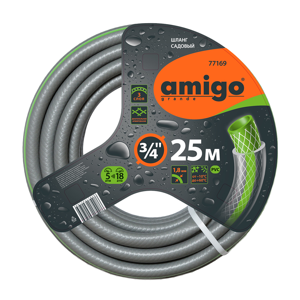 Садовый трехслойный шланг AMIGO 3/4", 25 м 77169 предназначен для полива, а так же для перекачки и прочих работ с жидкостями, в том числе с пищевыми.