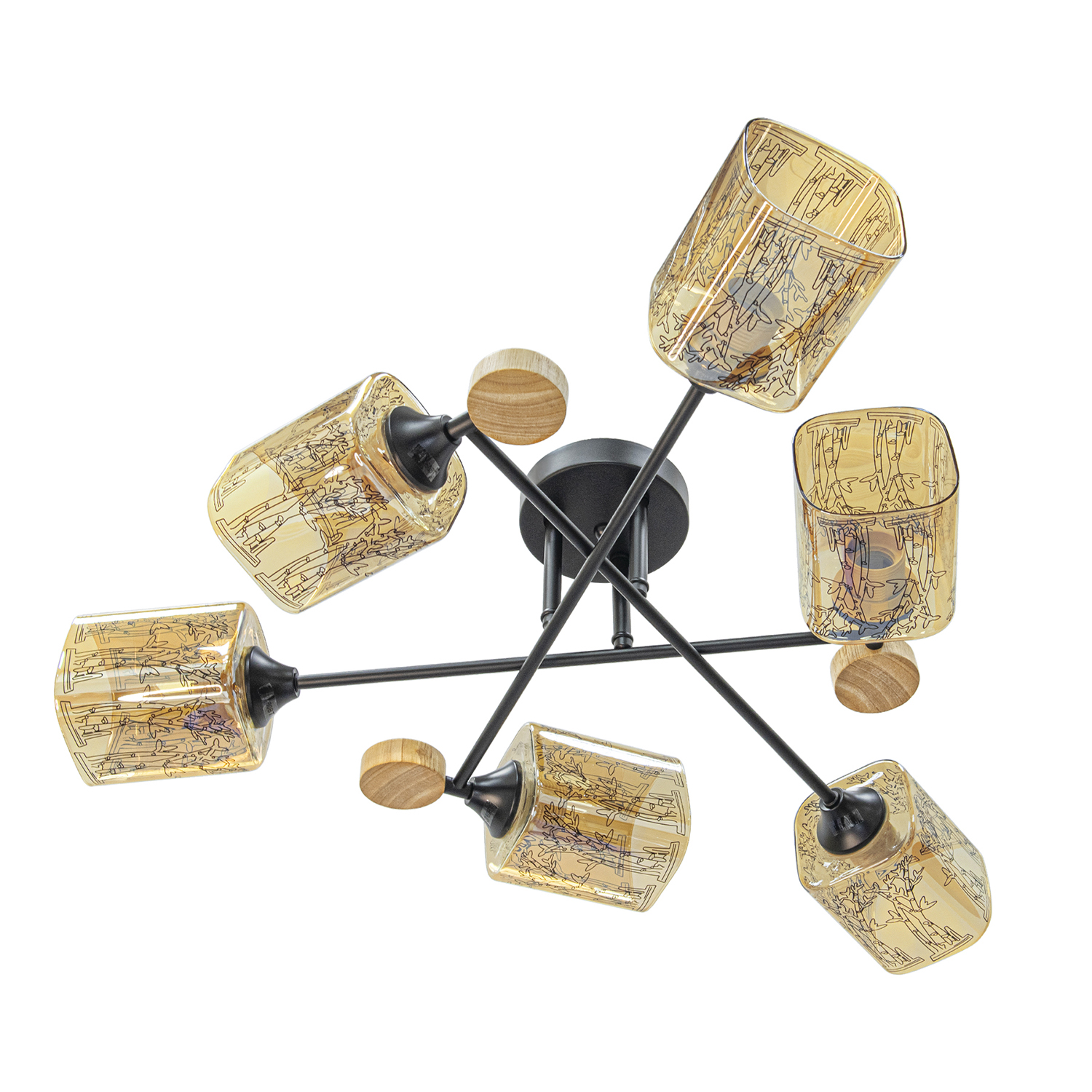 Потолочный светильник бытового предназначения на 6 светоточек. Состоит из круглого потолочного основания и 3-х прямых кронштейнов с 2-мя светоточками. Кронштейны крепятся на разном уровне по высоте и за счет этого пересекаются друг с другом. Рассеиватель стеклянный, прозрачный, квадратный цилиндр желто-коричневого цвета, с черным рисунком в виде дерева.