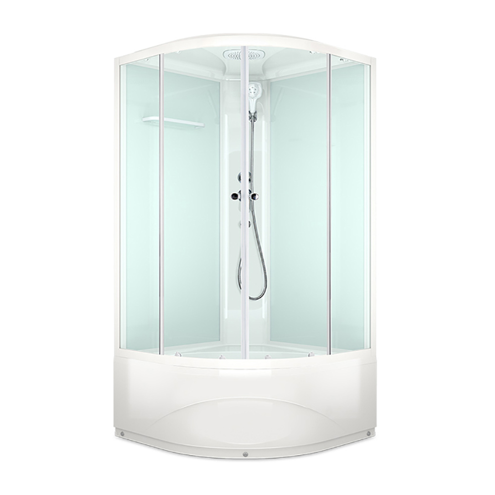 Угловая душевая кабина со стекляными прозрачными дверцами и белыми стенками и профилем. Высокий поддон. Открытие и закрытие двери одной рукой. В комплекте смеситель, верхний душ и ручной душ на гибком шланге. Полочка для ванных принадлежностей. Душевая кабина укомплектована сливными кнопками с системой забора волос и другого мусора, что позволяет сократить денежные расходы, связанные с чисткой или заменой канализации. Поддон усилен сплошной плитой ДСП 16 мм. Поддон, стенки и крыша изготовлены из прочного санитарного акрила.