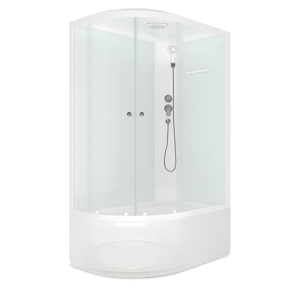 Угловая душевая кабина 120х80 со стекляными матовыми стеклами (угол справа), белыми стенками и профилем. Высокий поддон. В комплекте смеситель, верхний душ и ручной душ на гибком шланге. Полочка для ванных принадлежностей. Душевая кабина укомплектована сливными кнопками с системой забора волос и другого мусора, что позволяет сократить денежные расходы, связанные с чисткой или заменой канализации. Поддон усилен сплошной плитой ДСП 16 мм. Поддон, стенки и крыша изготовлены из прочного санитарного акрила.