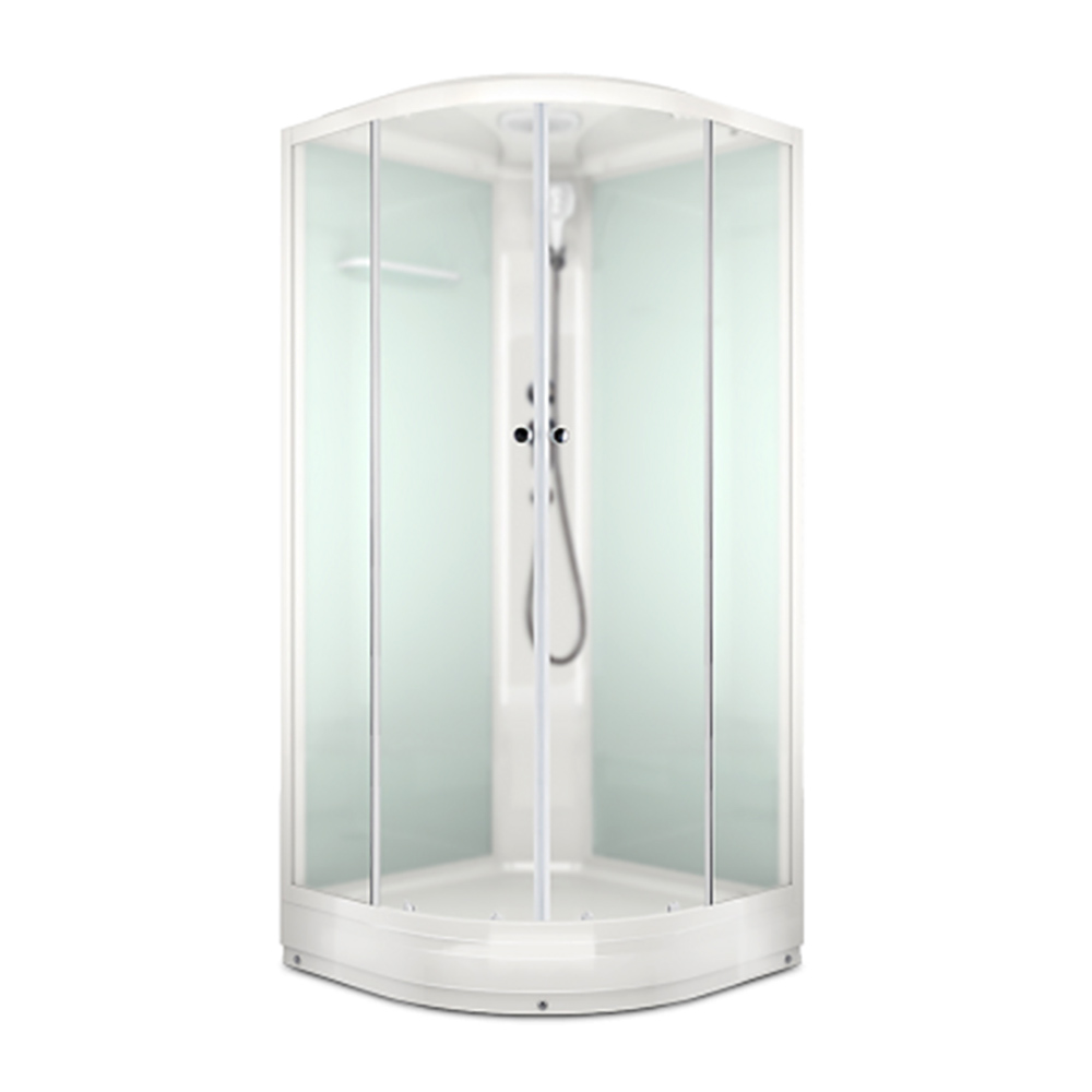Угловая душевая кабина со стекляными матовыми стеклами, белыми стенками и профилем. Низкий поддон. Открытие и закрытие двери одной рукой. В комплекте смеситель, верхний душ и ручной душ на гибком шланге. Полочка для ванных принадлежностей. душевая кабина укомплектована сливными кнопками с системой забора волос и другого мусора, что позволяет сократить денежные расходы, связанные с чисткой или заменой канализации. Поддон усилен сплошной плитой ДСП 16 мм. Поддон, стенки и крыша изготовлены из прочного санитарного акрила.