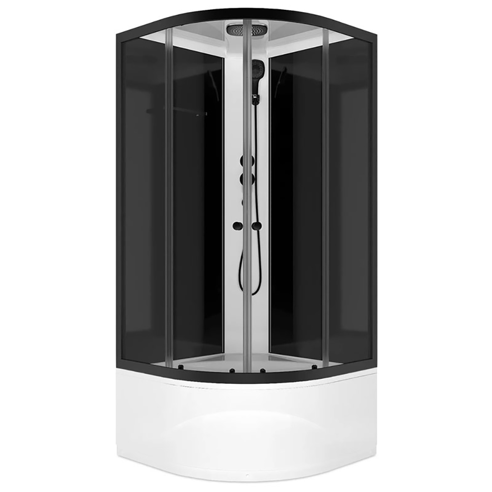 Угловая душевая кабина с прозрачными стеклами, черными стенками и черным профилем. Высокий поддон. Открытие и закрытие двери одной рукой. В комплекте смеситель, верхний душ и ручной душ на гибком шланге в черном цвете. Полочка для ванных принадлежностей. Душевая кабина укомплектована сливными кнопками с системой забора волос и другого мусора, что позволяет сократить денежные расходы, связанные с чисткой или заменой канализации. Поддон усилен сплошной плитой ДСП 16 мм. Поддон, стенки и крыша изготовлены из прочного санитарного акрила.
