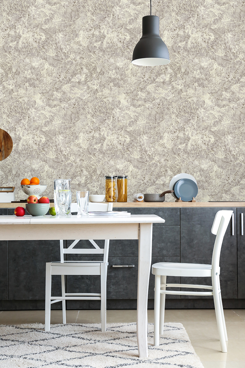 Коллекция «Орион» кухонный винил 0,53*10 м – естественность и природный характер рисунка, мягкость и лаконичность. Игра света и тени, сложная текстура с эффектом необработанной поверхности и тонкие цветовые вариации создают интересную и притягательную композицию. Поверхность обоев имеет шероховатую, и неровную текстуру. Сочетание визуально рельефных участков и впадин создает ощущение глубины и возраста. Крупные каменные прожилки подчеркнуты металлическим блеском, дающим блики при освещении.