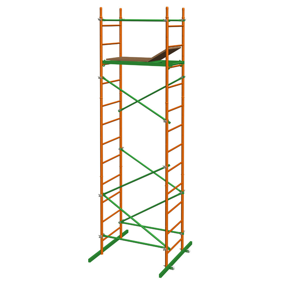 Вышка-тура «Компакт». Эконом вариант, диаметр трубы 32мм. Поставляется готовым для сборки пакетом из 3-х секций с общей высотой в собранном виде 4,2м (высота до рабочей площадки 3м). Вышка оснащена двумя колёсиками для удобства передвижения по полу. Размер рабочей площадки 1,2х0,7м. Вышка не наращивается! Если сборку осуществлять посекционно, можно собрать конструкцию с высотой соответственно 1 секция - 1,4м (0,9м до рабочей площадки), 2 секции - 2,8м (1,7м) и 3 секции - 4,2м (3м).