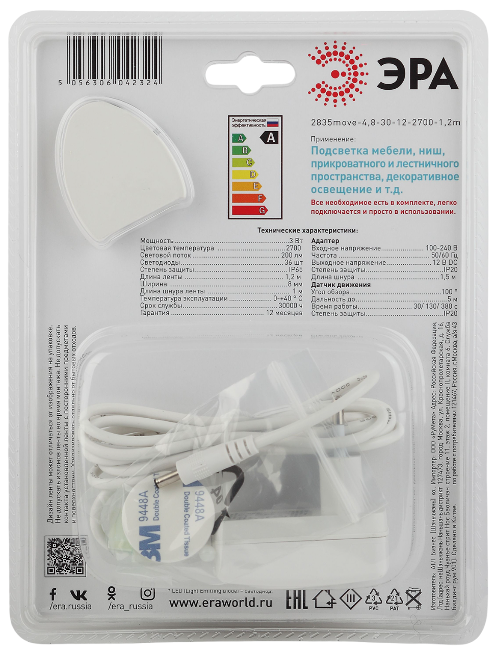 Комплект светодиодной ленты 2835move-4,8-30-12-2700-1,2m идеально подходит для подсветки мебели, ниш, систем хранения, лестничных и прикроватных пространств, проходных помещений. В состав комплекта входит LED-лента на двустороннем скотче, источник питания, оптический датчик движения, коннекторы. Датчик срабатывает только в условиях низкой освещенности.