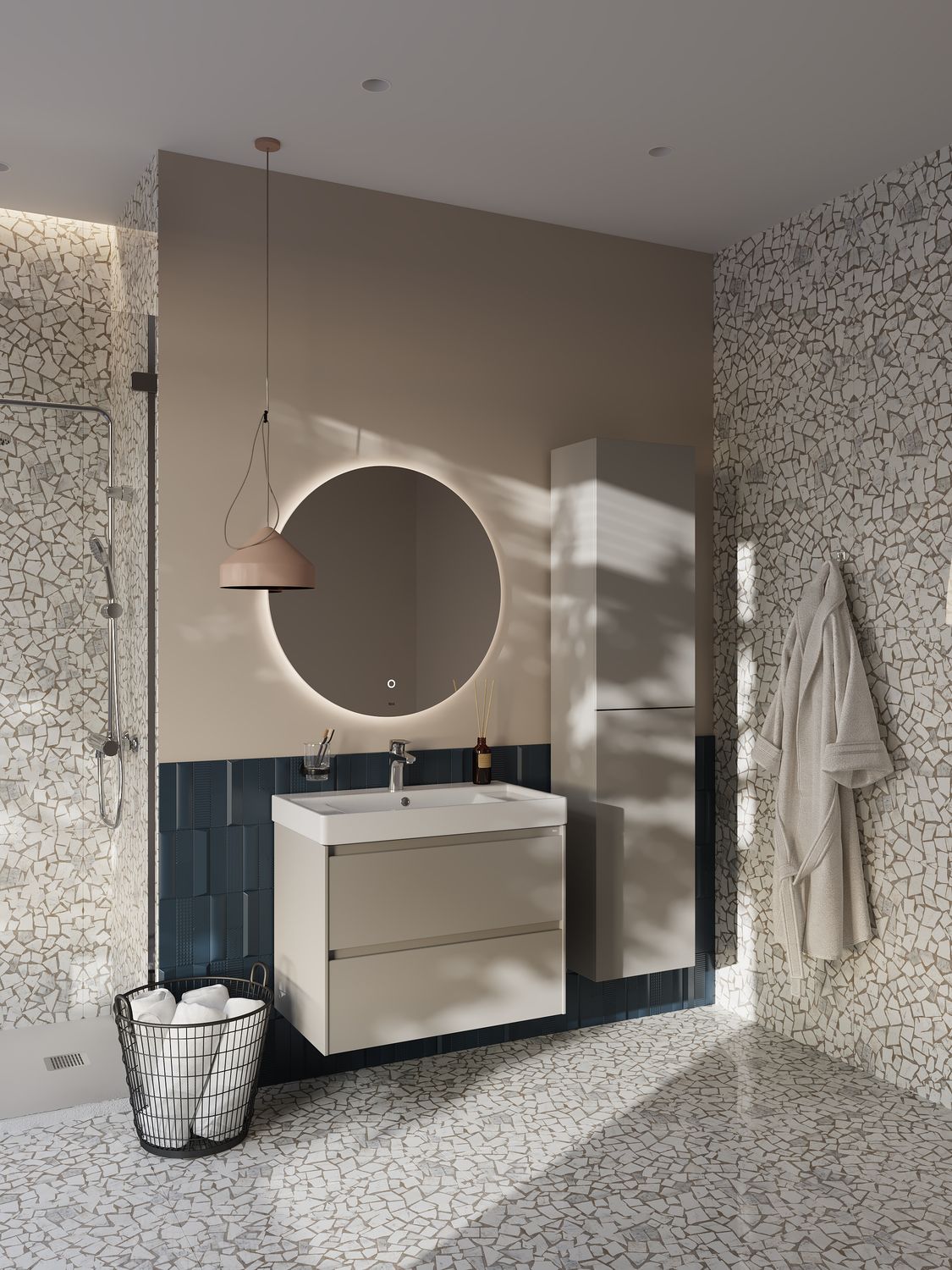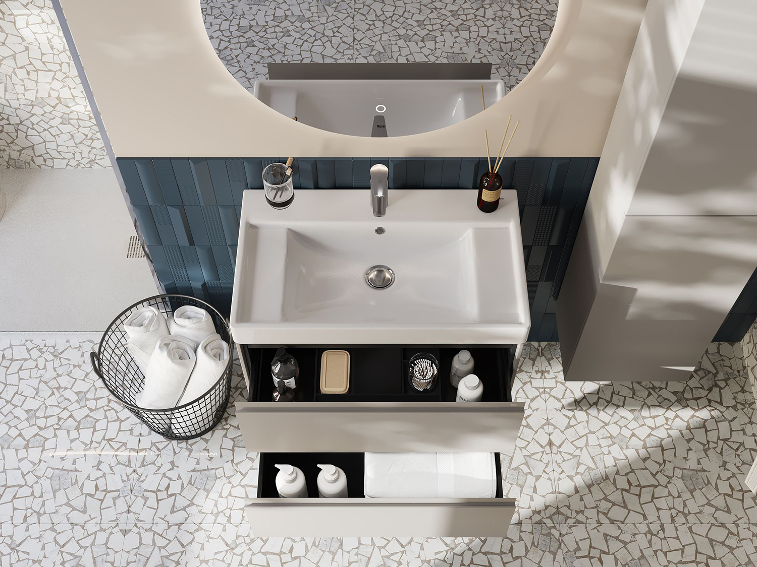 Погрузитесь в атмосферу Средиземноморья в вашей ванной комнате вместе с коллекцией Ona. Влагостойкие материалы и пленки от европейских производителей — это красота, долговечность и безупречный вид мебели на долгие годы. Удобная металлическая профильная ручка во всю ширину модуля обеспечивает легкость открывания ящиков и защиту фасадов от влаги, ударов и износа. В обоих ящиках находятся противоскользящие коврики, а верхний ящик снабжен также встроенной организацией пространства – эстетика и идеальный порядок в ванной комнате.