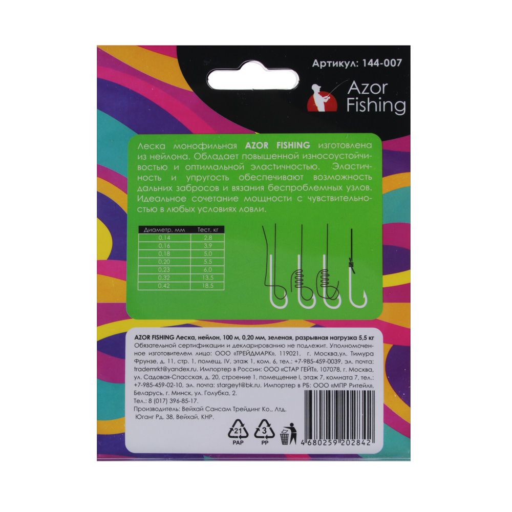 Нейлоновая леска Azor Fishing "Карась, Плотва" диаметром 0,20 мм выдерживает рыбу весом до 5,5 кг. Хороший вариант для речек богатых корягами и водорослями. Обладает отменными амортизирующими свойствами. При сильном рывке вместо того, чтобы оборваться, она растягивается. Как результат — рыбак не потеряет снасти и улов. Леска из нейлона не скручивается, не помнит прошлых намоток. Имеет средний уровень прочности. При забросе не путается. Цвет - зелёный.